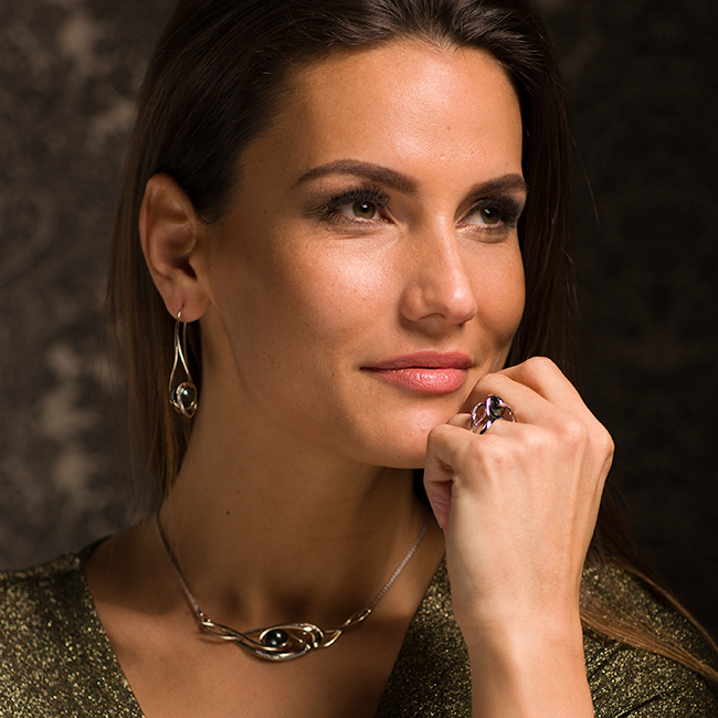 A white gold ring with Tahitian pearls, featuring a romantic, swirling design. The curves are highlighted with brilliant-cut diamonds.