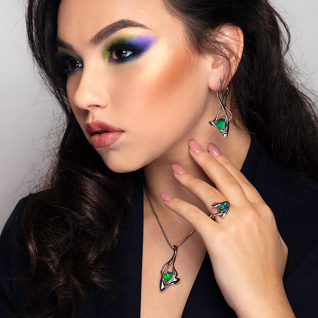 A stylized dolphin-shaped white gold pendant decorated with a unique iridescent Australian opal