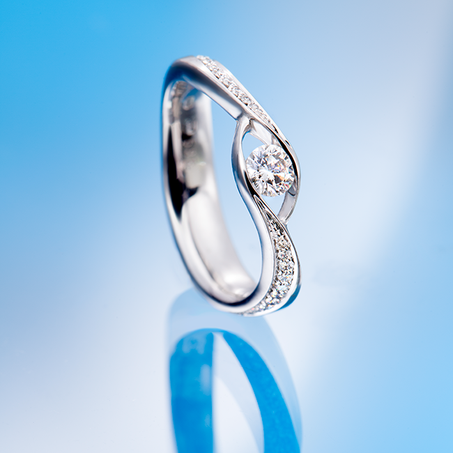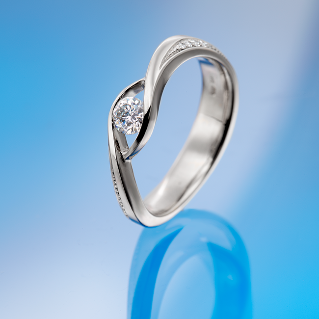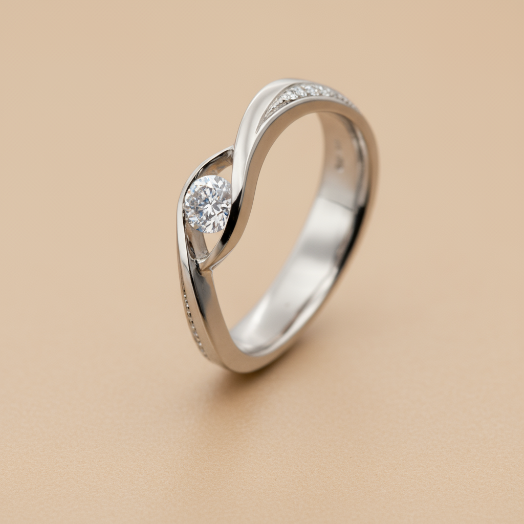 A classic, simple white gold ring embraces a high-quality diamond