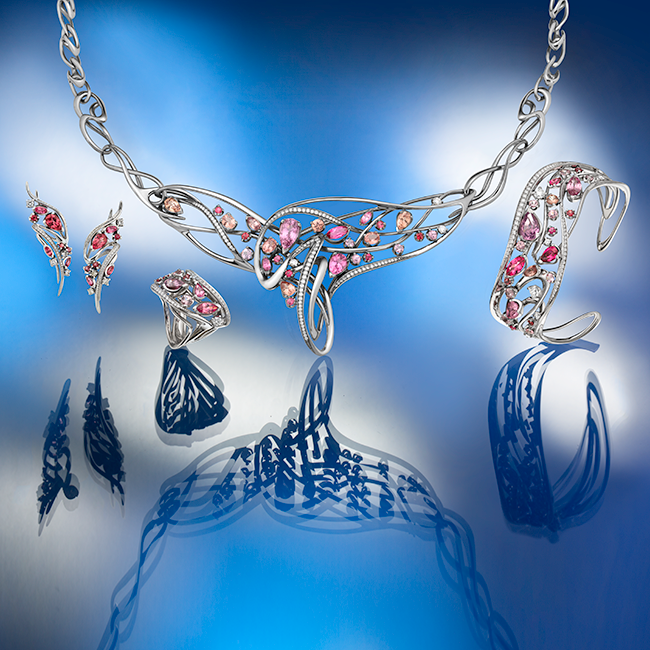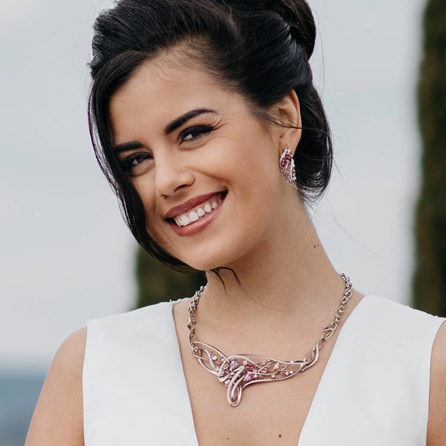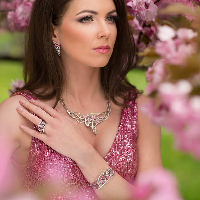 A light, white gold earring with shades of pink, reminiscent of spring and cherry blossoms