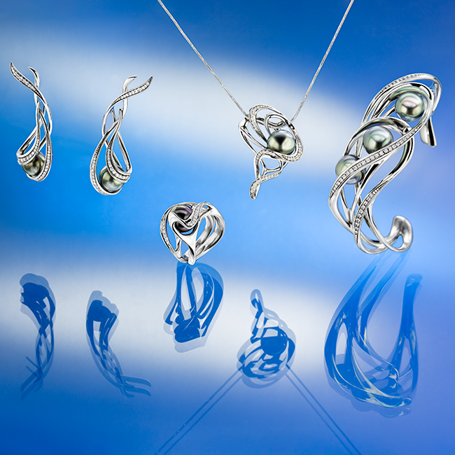 A unique design of white gold earrings featuring a magnificent black Tahitian pearl. The swirling curves are highlighted by brilliant-cut diamonds.