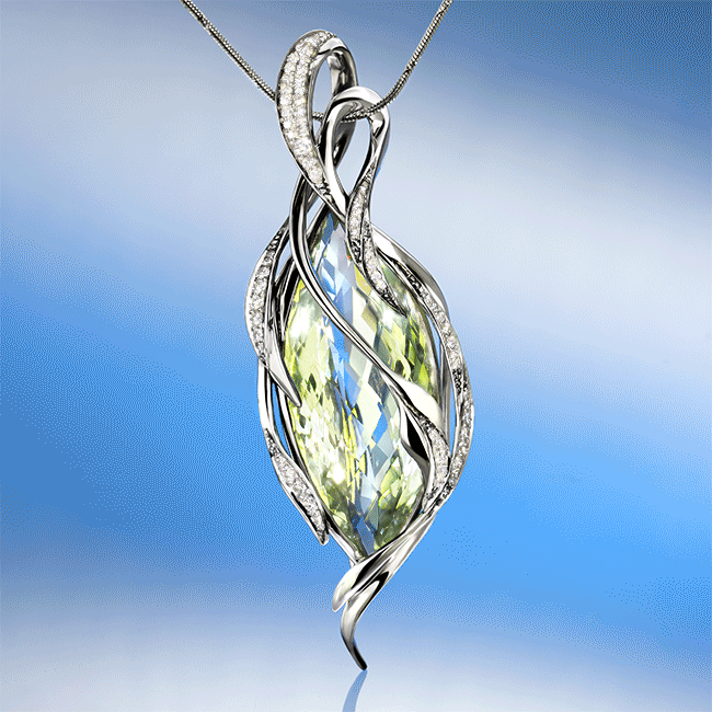 Juze medál - 14k, fehér arany, gyémántok,prasiolite