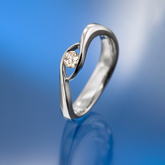 Klasszikus, egyszerű fazonú fehér arany gyűrű öleli körbe a kiváló minőségű gyémántot