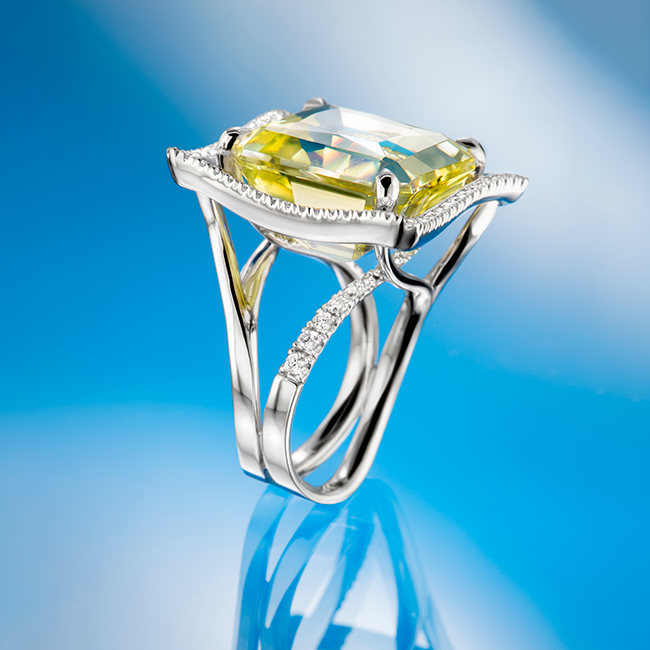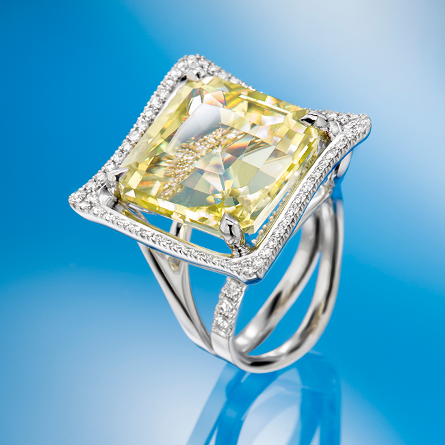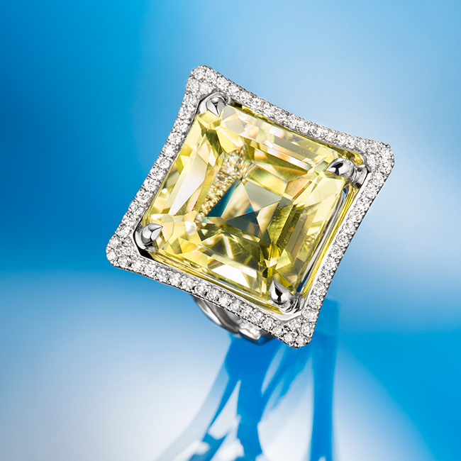 Attraktív, látványos koktél gyűrű fehér aranyból, citrinnel és gyémántokkal