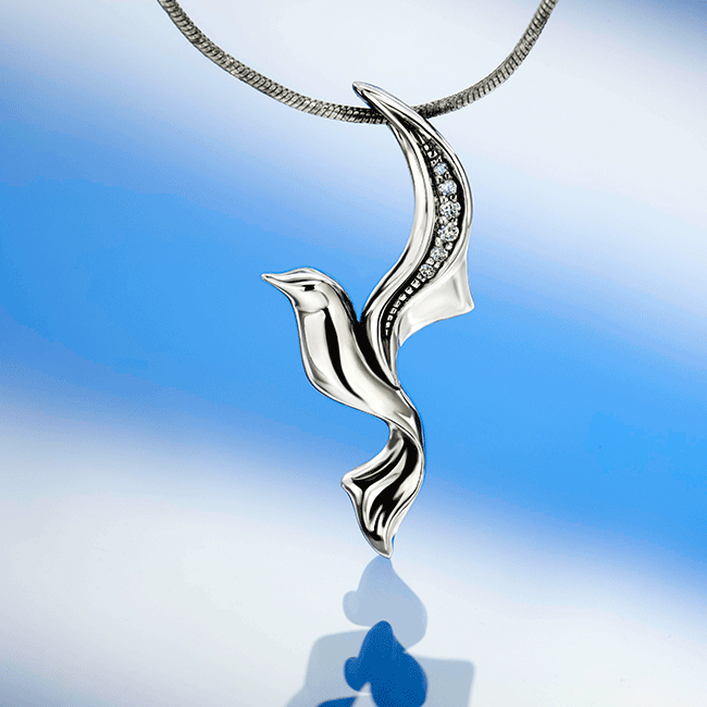 Finom, könnyed eleganciát sugárzó madár formájú fehér arany medál gyémántokkal díszítve