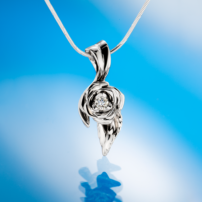 Rózsa formájú fehér arany medál briliáns csiszolású gyémánttal